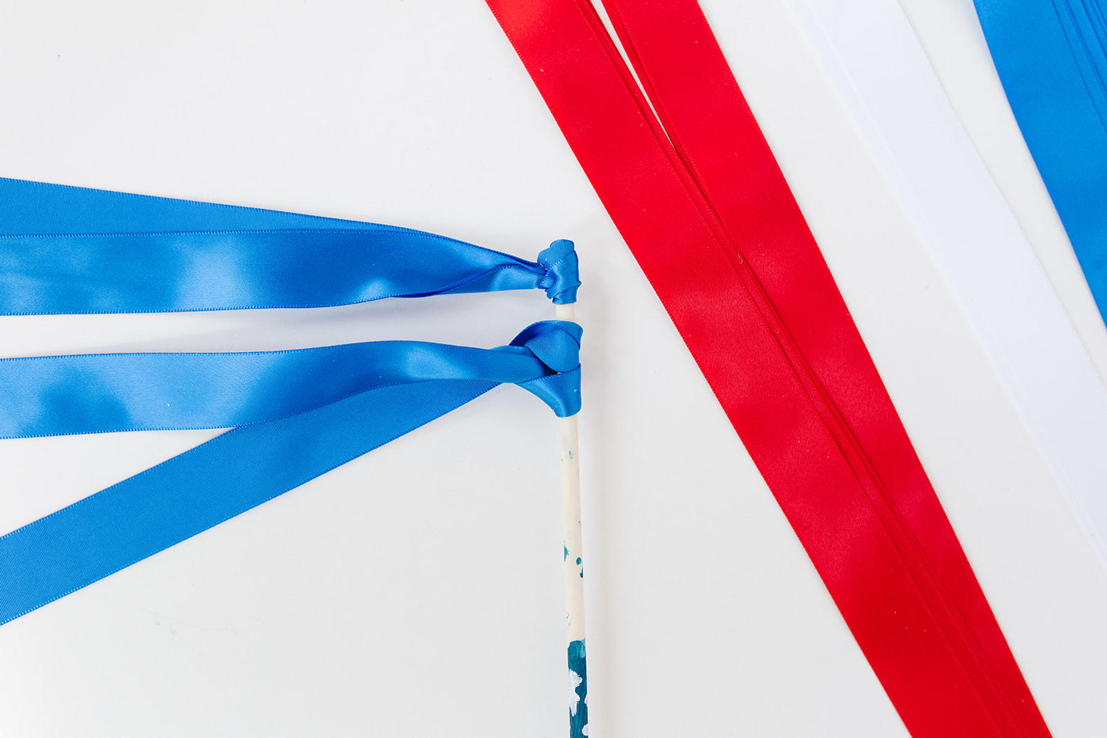 12” Wooden dowels from craft store, blue and white Acrylic paint, 1” rolls of Satin ribbon: 2 blue, 2 red, and 2 white, thin bristle paint brush, foam brush, and a hot glue gun.