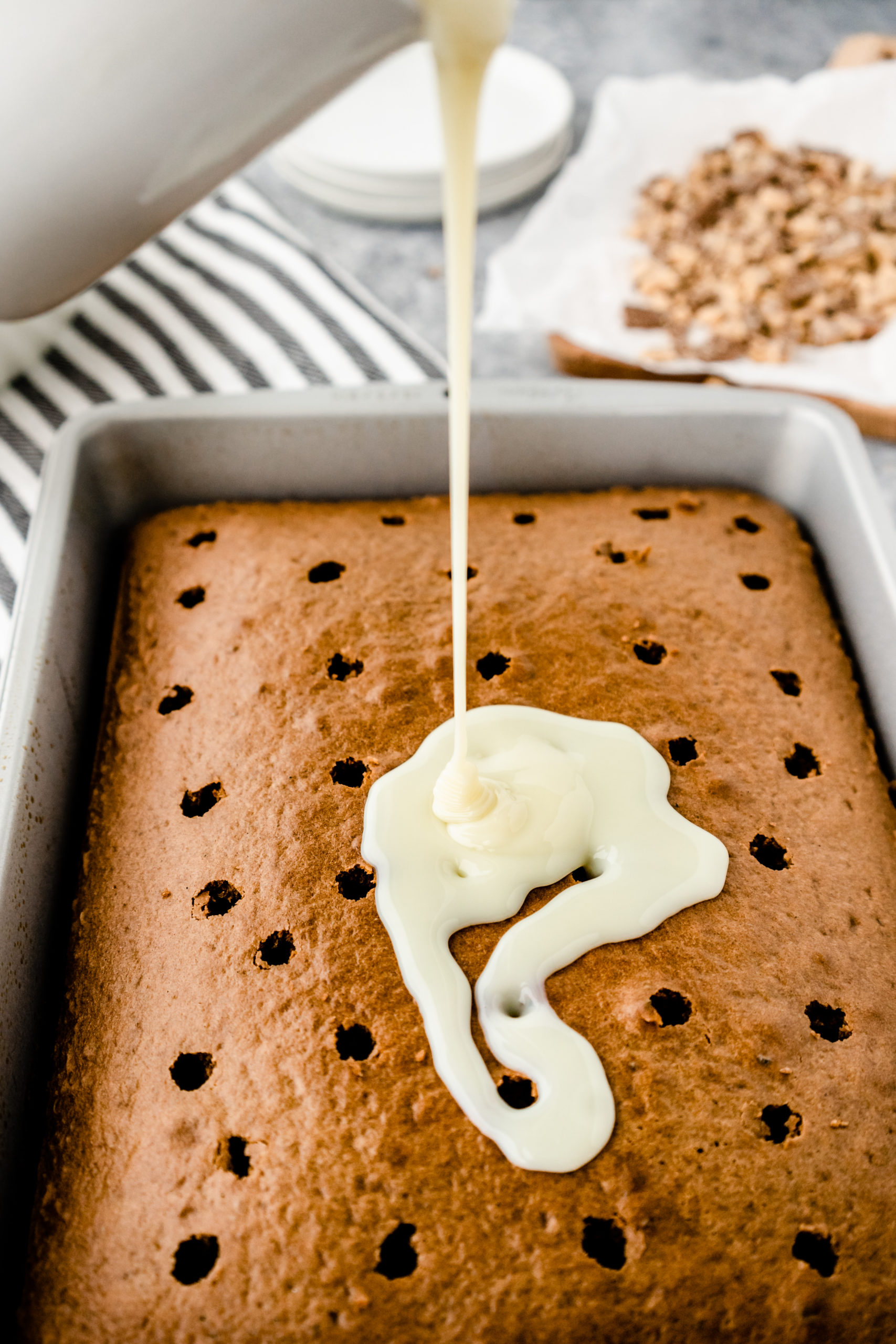 • With the back of a wooden spoon, poke cake every 1/2 inch or so