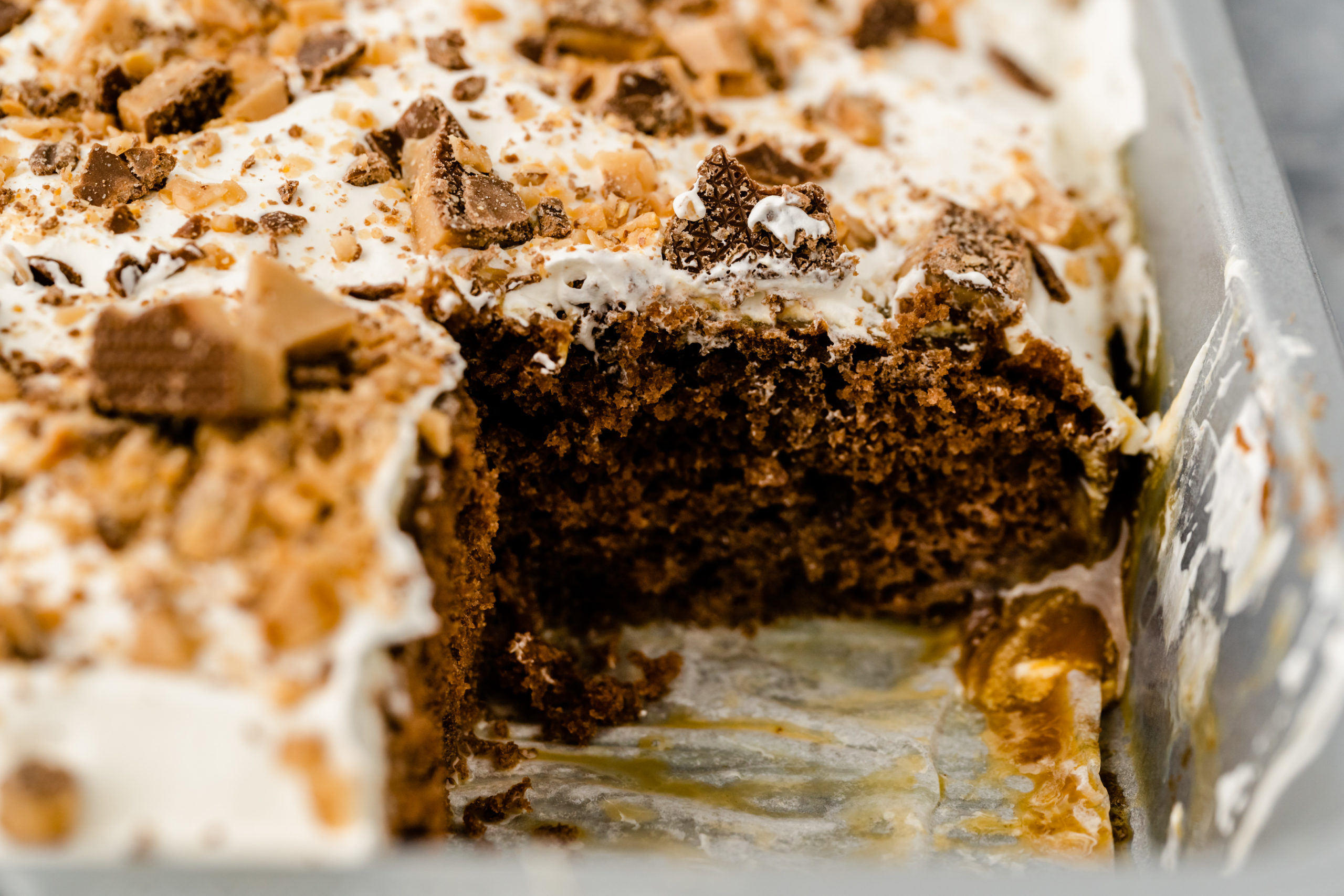 • Spread Cool Whip over top of cake and crumble toffee chips on top.