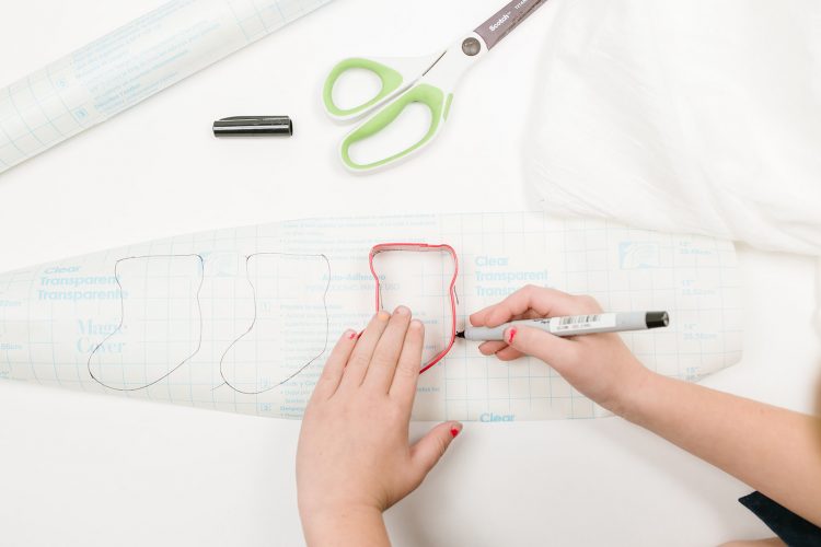 On the back paper side of the contact paper, take your fine sharpie and trace your cookie cutters.