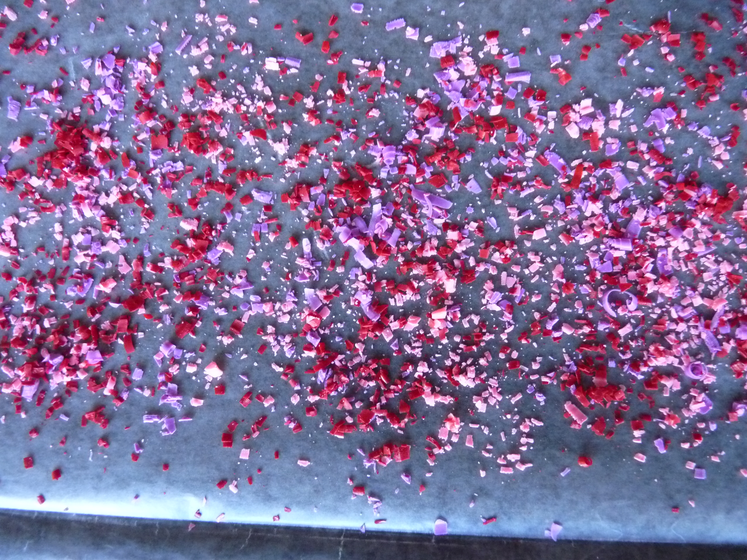 The instructions tell you to use a pencil sharpener to make shavings from the crayons. I found this to be a tedious process, so I grabbed my vegetable peeler. It goes a lot faster with the vegetable peeler! I wasn’t sure how much the shavings would spread out when melted, so I decided not to put too much on the first time.