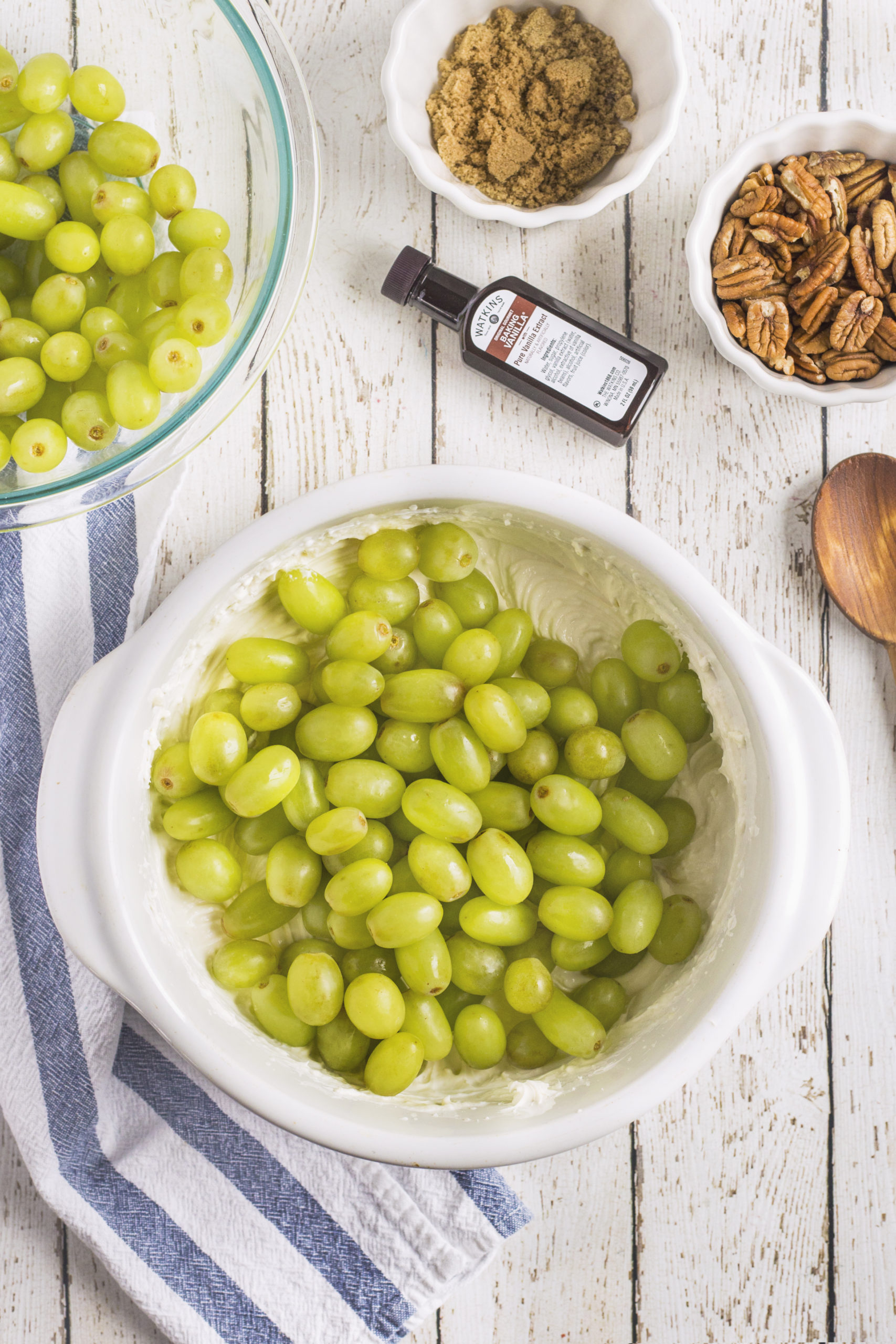 • Wash and dry grapes. In a large bowl, mix together the cream cheese, sour cream, sugar and vanilla. Add grapes and mix until evenly incorporated. Sprinkle with brown sugar and pecans, mix again and refrigerate until serving.