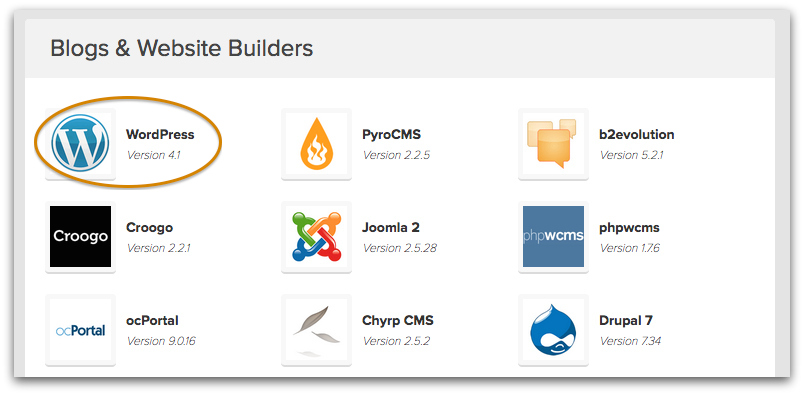 Once you click on the “One-Click Installs” icon, it will take you the Install Websites and Applications page. Scroll down this page until you see WordPress and select it.