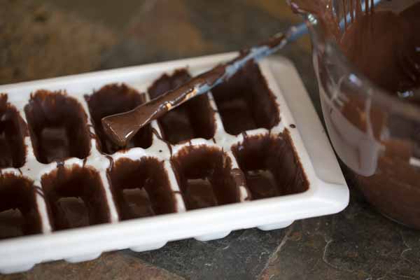 Spoon 1/2 Tablespoon of melted chocolate into each section of the ice cube tray.