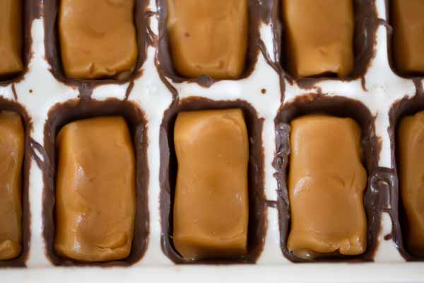 After caramels have been placed, spoon about another 1/2 Tablespoon of melted chocolate on top of each section until the caramel has been covered and the top is flat.