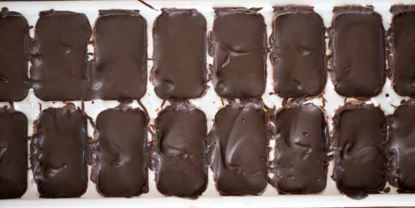 Let set. After the chocolate has set, cut the Peter’s Caramel into rectangles and fit them into each section of the ice cube tray.