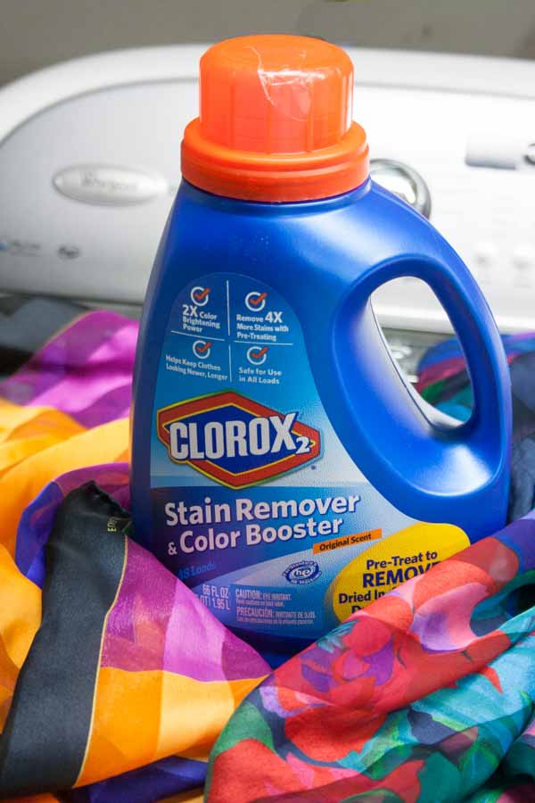 Keep your memories bright with Clorox 2 Stain Remover and Color BoosterI just toss my scarves into my washing machine and add the Clorox2 along with my favorite detergent right into the wash basin. For best results, start the washer and add both your detergent and Clorox2 before adding your clothes. Using Clorox 2 extends the life of your wardrobe and keep your clothes looking newer longer.  Just take a look at my scarves!