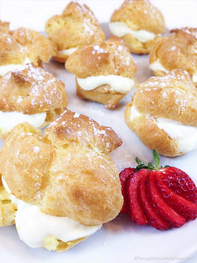 It’s Allie here from Through Her Looking Glass again and I’m thrilled to be sharing these delicious Lemon Filled Cream Puffs with you today. Spring has finally sprung in New Hampshire and I’m so glad! After many drab and dreary winter days, it appears that spring is finally here to stay. Yay! These cream puffs are the perfect spring dessert for Easter or make a beautiful presentation for baby and wedding showers.