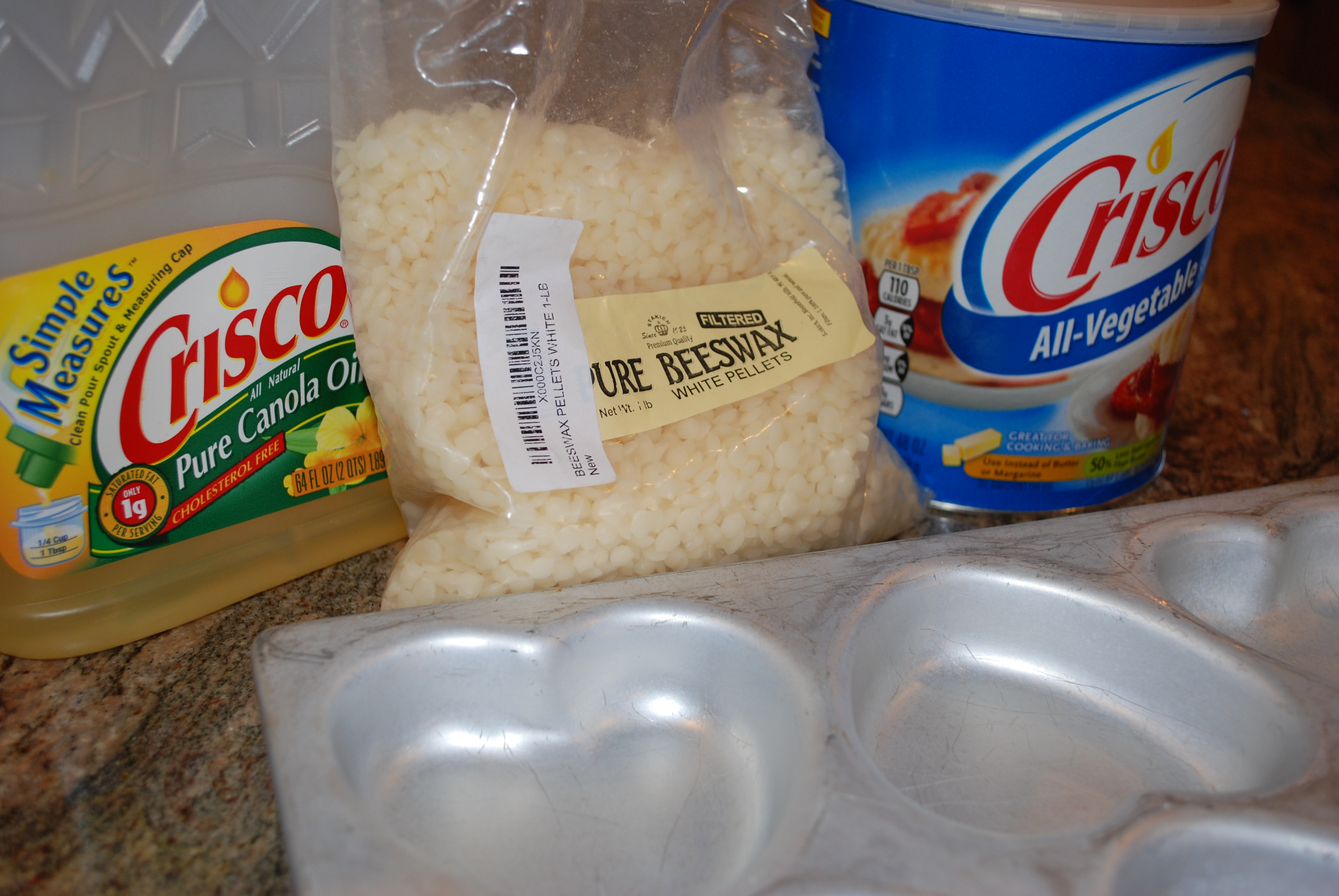 All you need to make these is a shaped pan, vegetable shortening, vegetable oil and beeswax. I purchased my beeswax through Amazon.