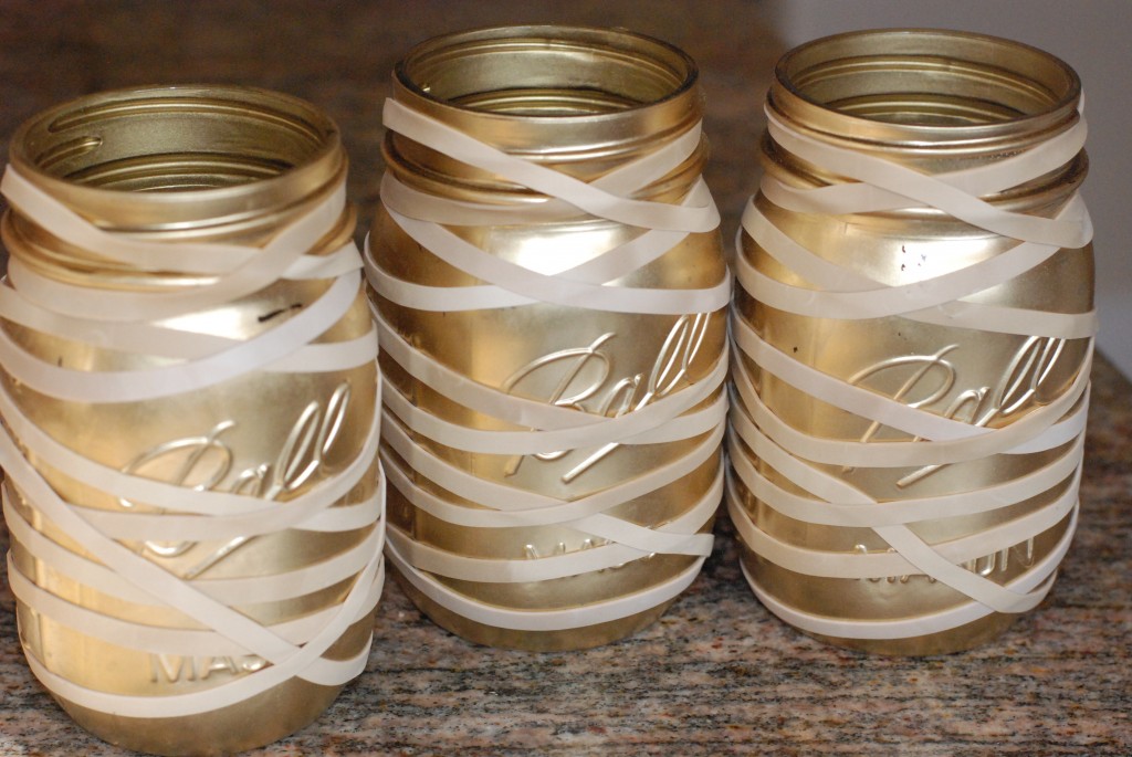 After the gold paint has thoroughly dried, take the rubber bands and wrap them around your jars.   Make sure to leave a little room in the front for your eyes!