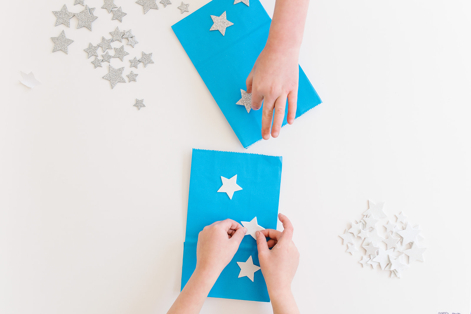 Ok, so here we go. Stick the star stickers on to the blue bag.