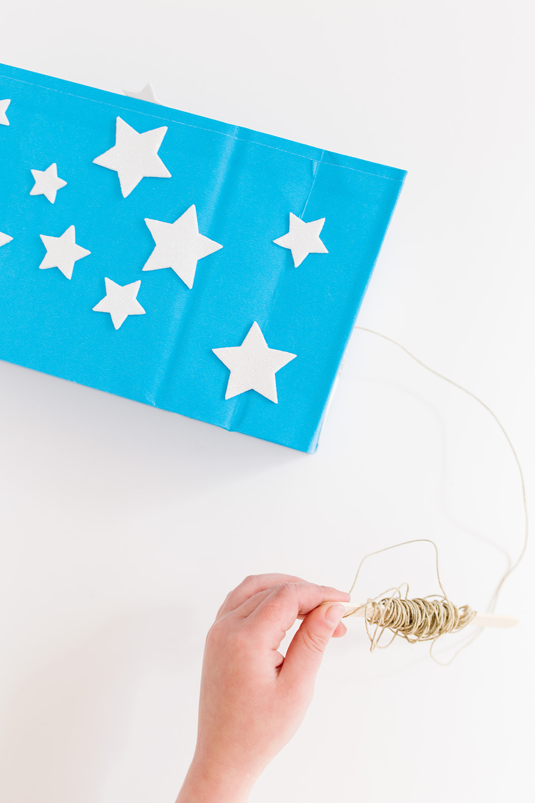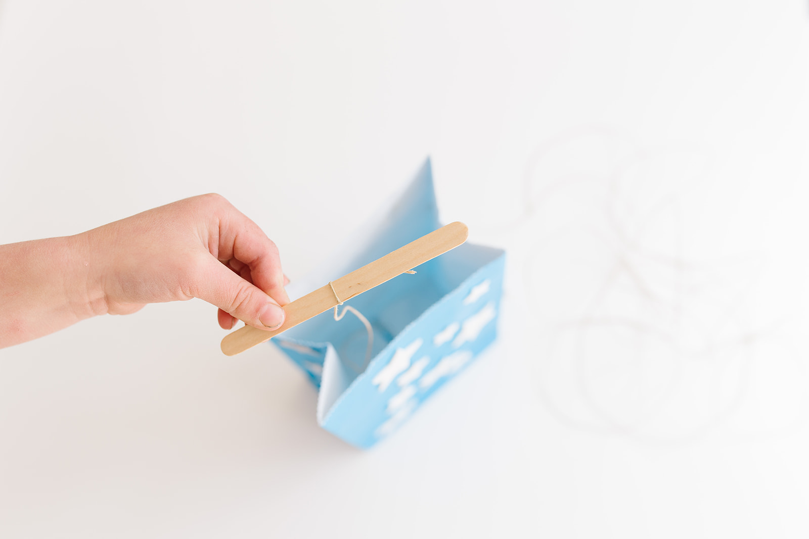 From the outside, stick the end of your yarn or twine through the hole of your bag and tie it on to a popsicle stick. Pull your yarn until the popsicle stick rests on the bottom of the inside of your bag.