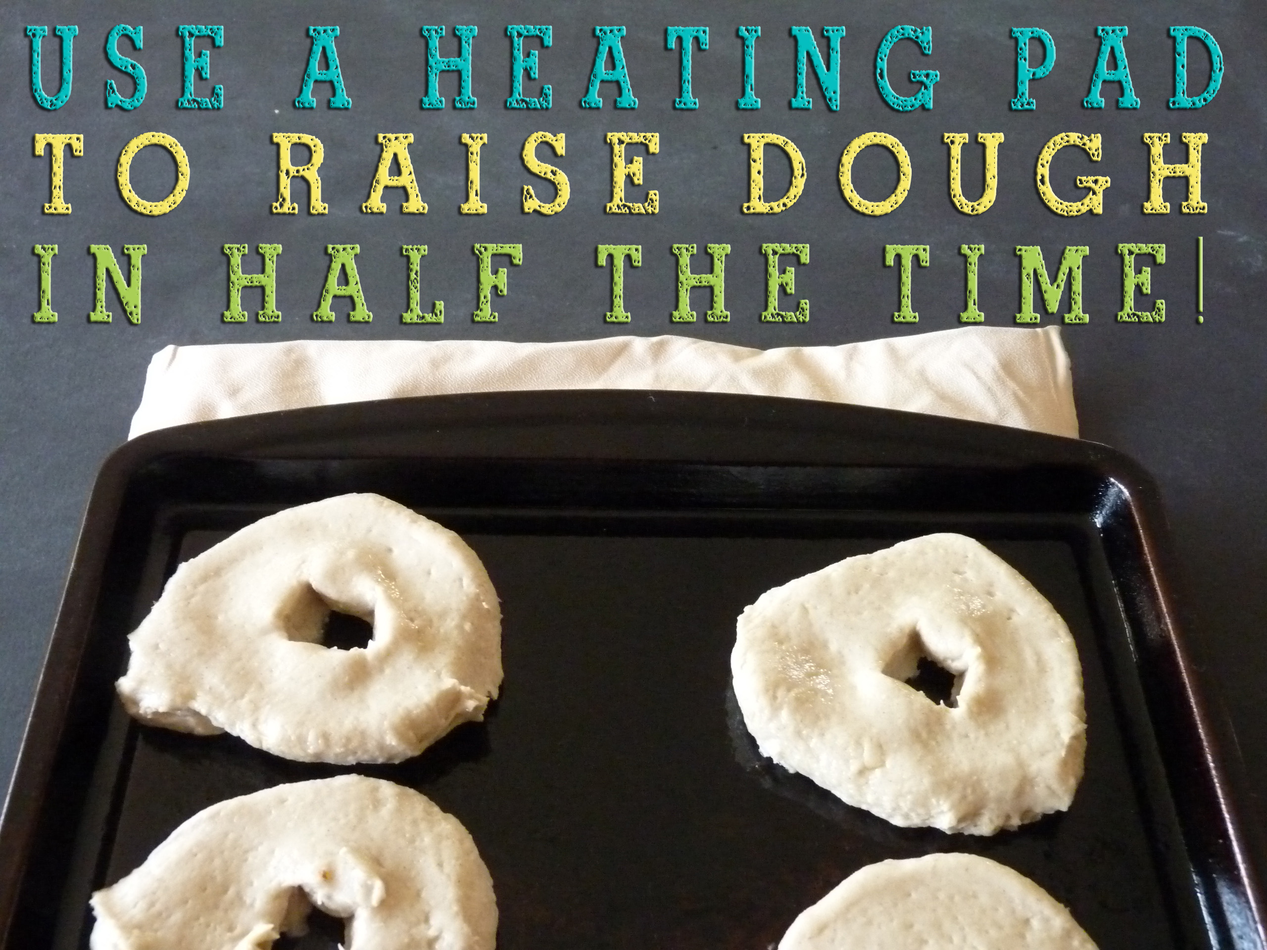 I just LOVE, LOVE, LOVE the smell of home baked bread of any kind! Then there is the taste of warm bread with butter slathered all over it, heaven! But, who has time for homemade bread? I know many of us have bread machine,s but I don’t always like the way the crust turns out. Since going gluten free I make bread and bagels from a GF mix. Again, I don’t like the way they turn out from the bread machine. So, when I found this pin I was REALLY hoping it would work and save me some time. I tried this method out on GF bagels that require a 1 hour rise time. I chose the medium setting hoping it would be just the right temperature. Woot, woot! I was correct, and my bagels rose in half the time! Happy day for me. I make homemade bagels about once a week, cutting the rise time in half is a really big deal to me. So there is only one thing left to do. Go to Target and buy another heating pad so I can quick rise two pans at once! Thank you Robyn from The Pink Peony of Le Jardin for the great idea!