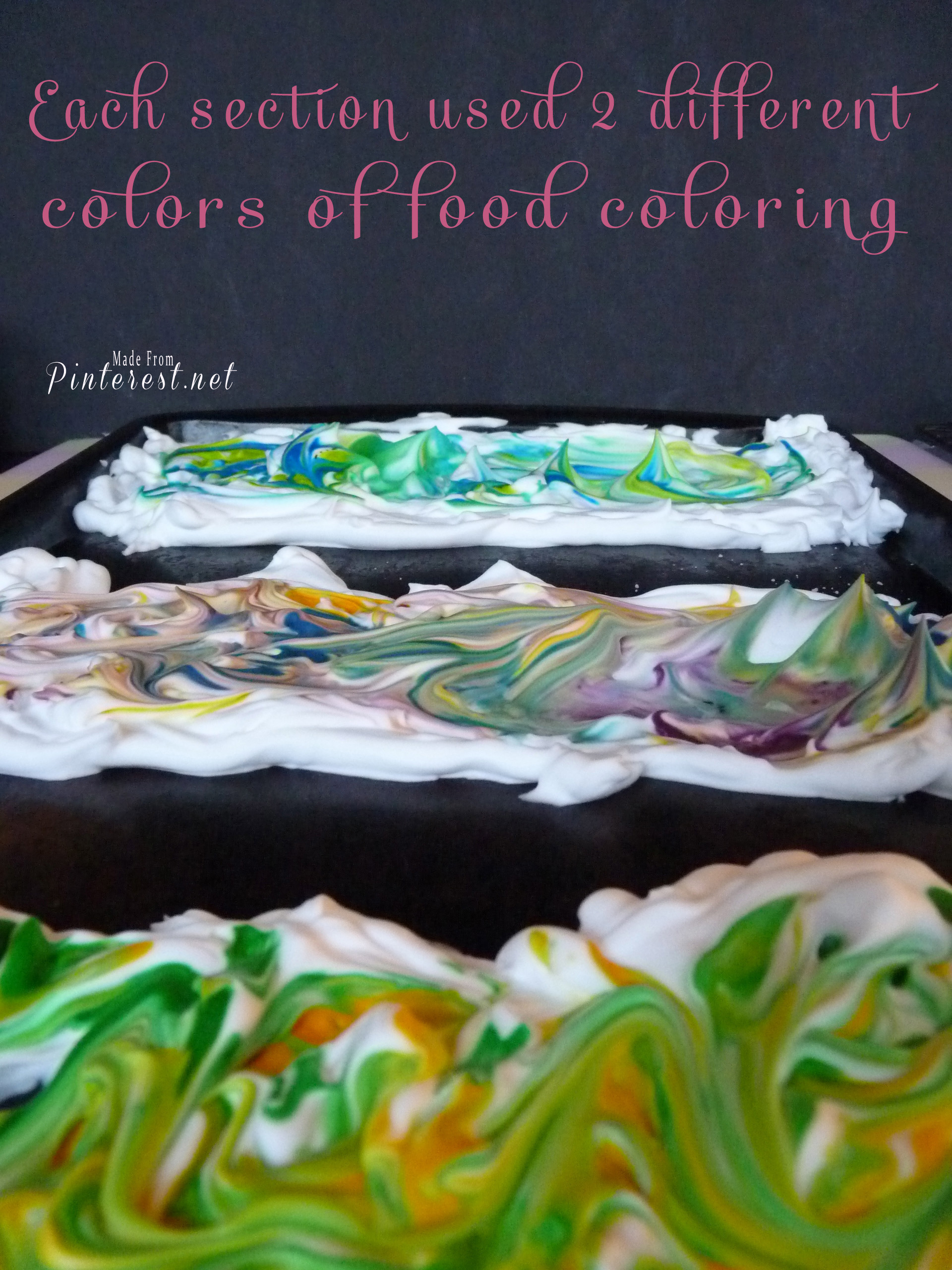 If shaving cream becomes overly mixed just make another section and add food coloring and swirl again