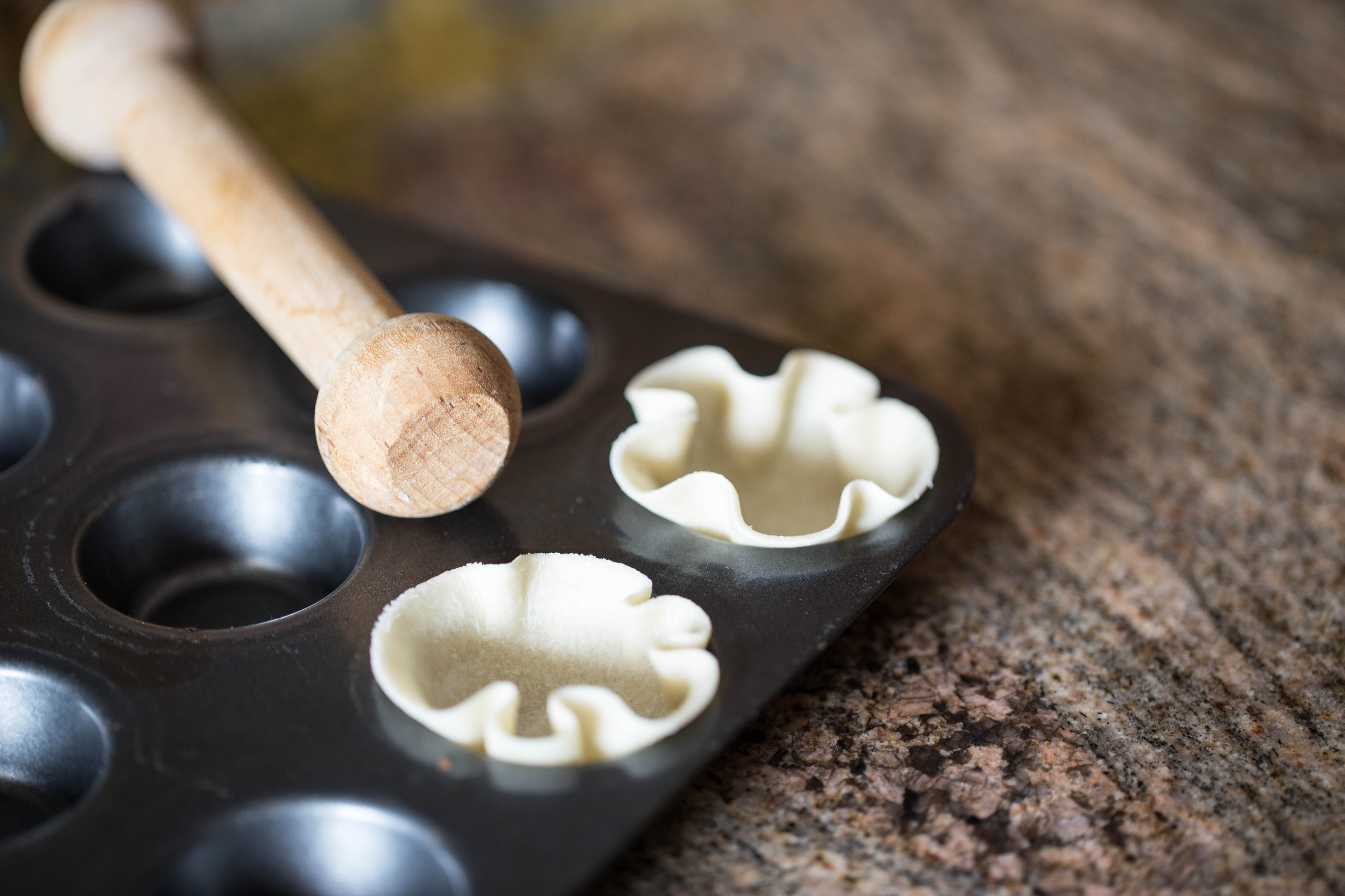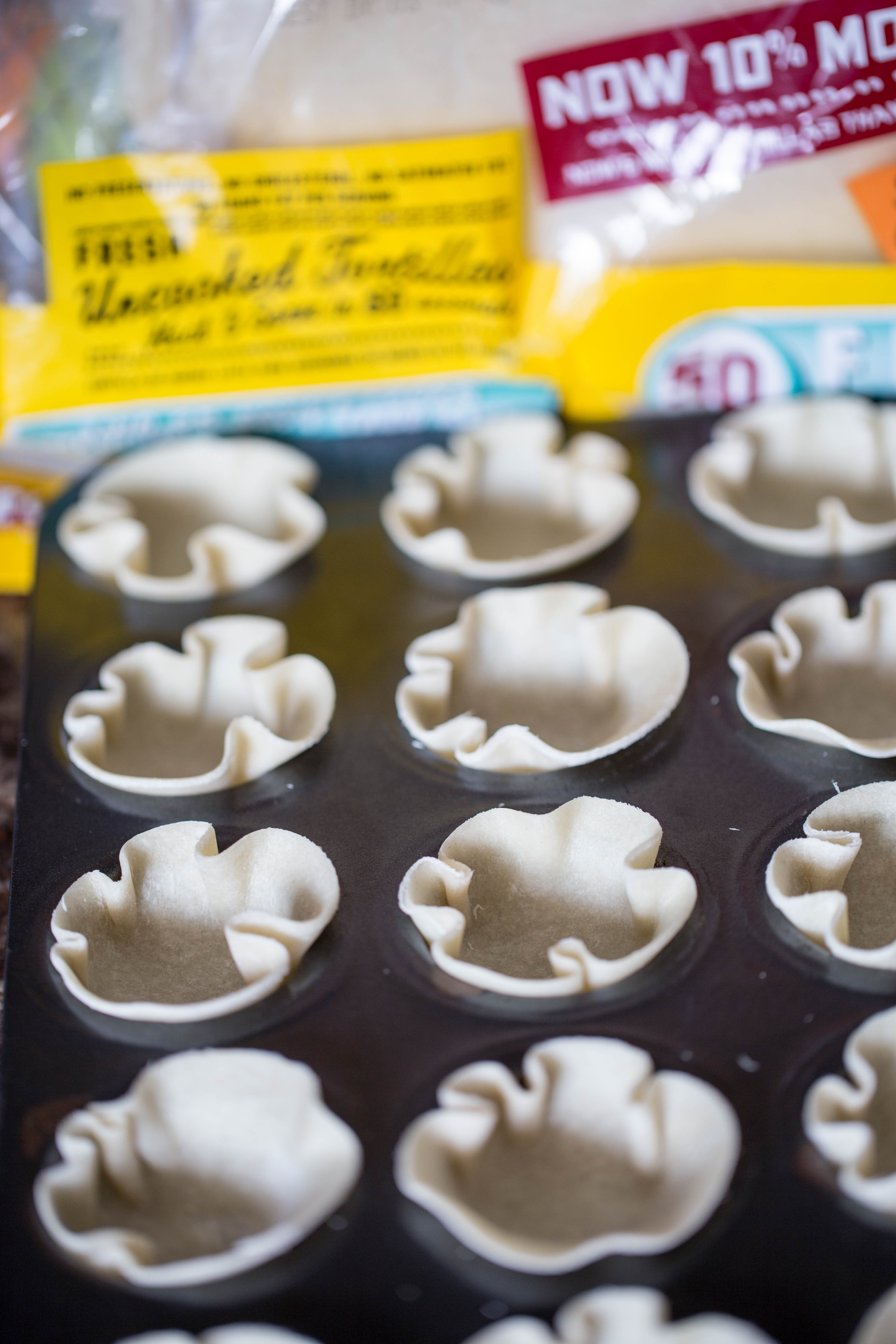 Place each round tortilla into a mini muffin pan.  I have this little pestle that I use to push them down into the muffin space which helps to make the beautiful ruffles around the edges.  You can also just use your fingers to push them down and get the same result.