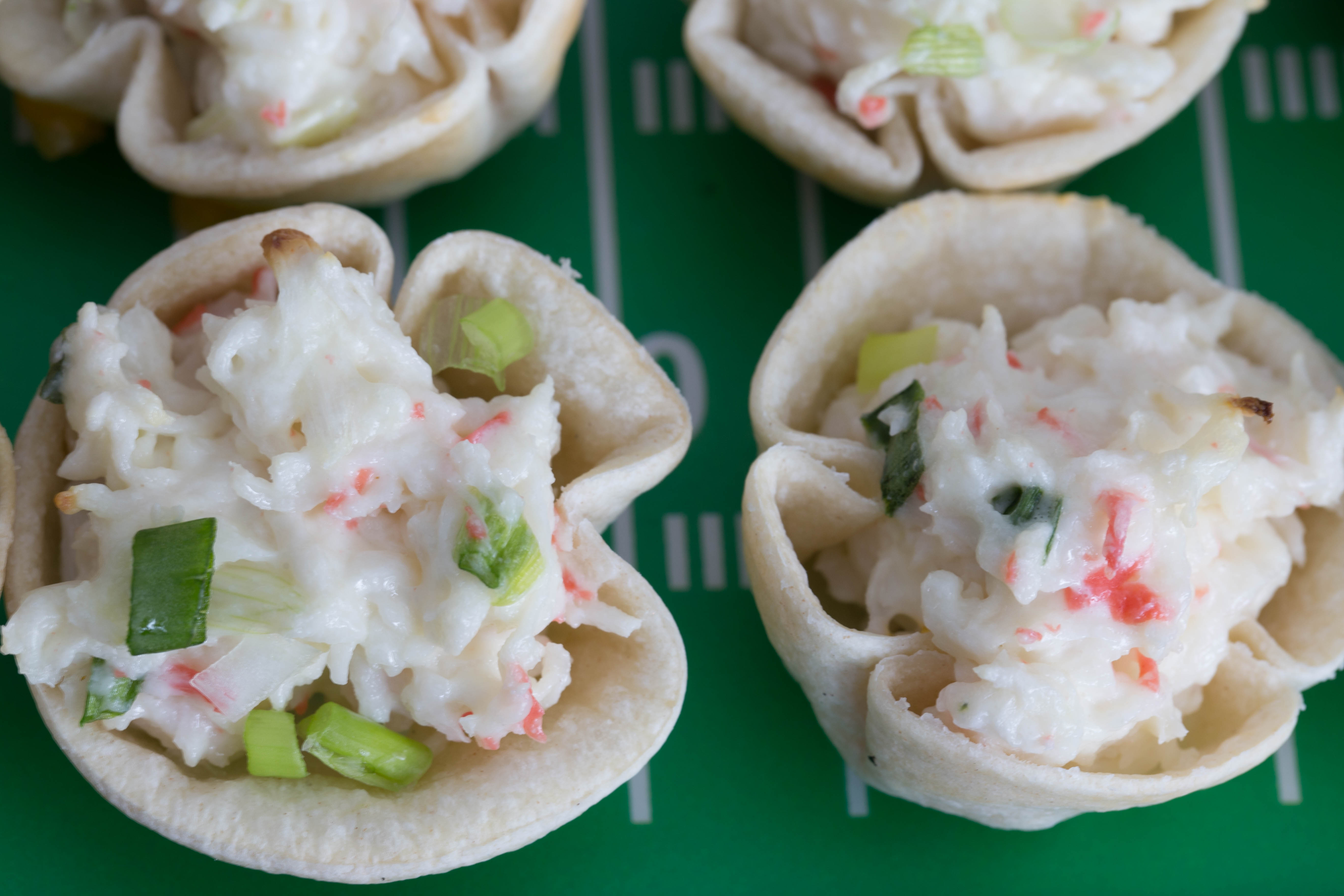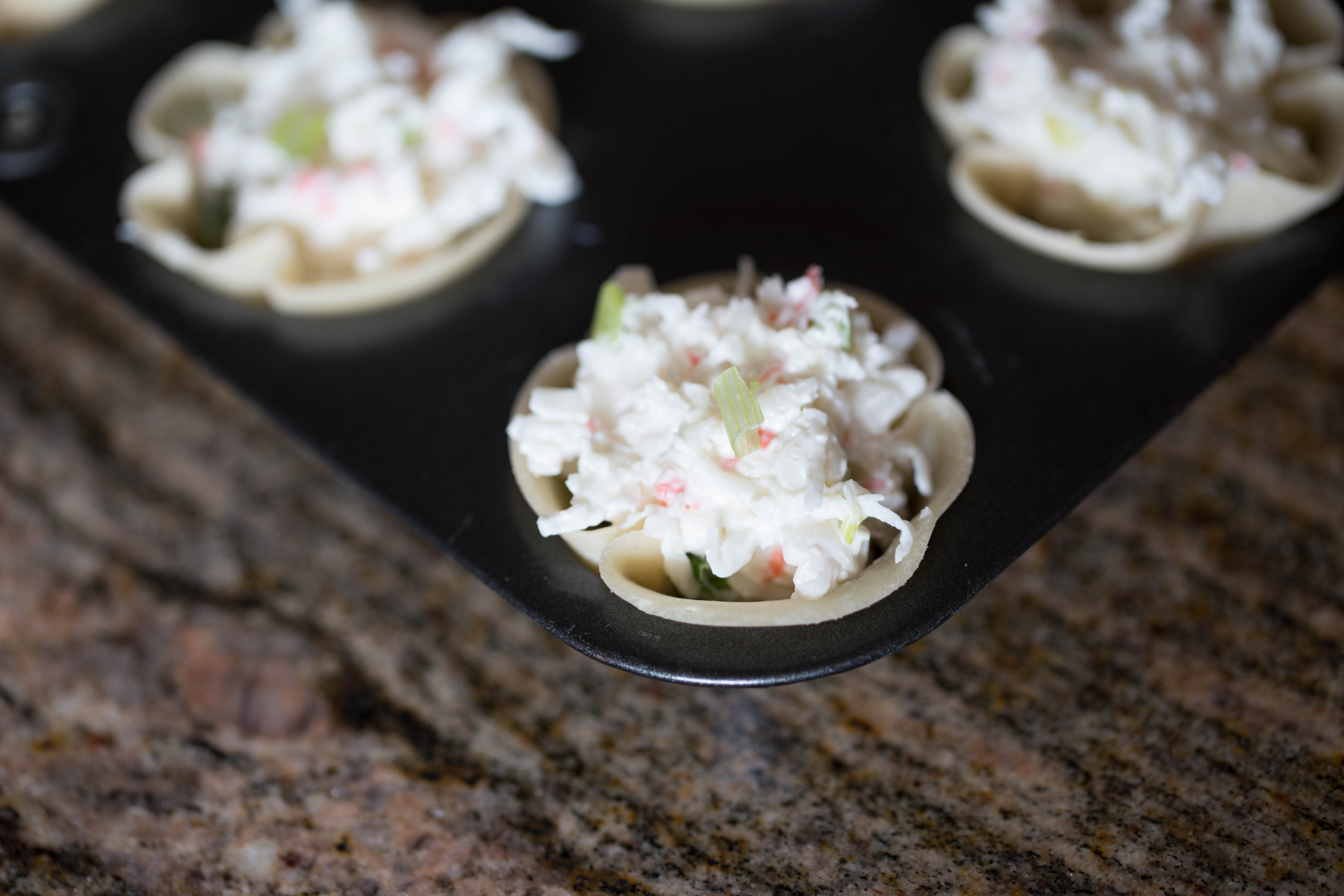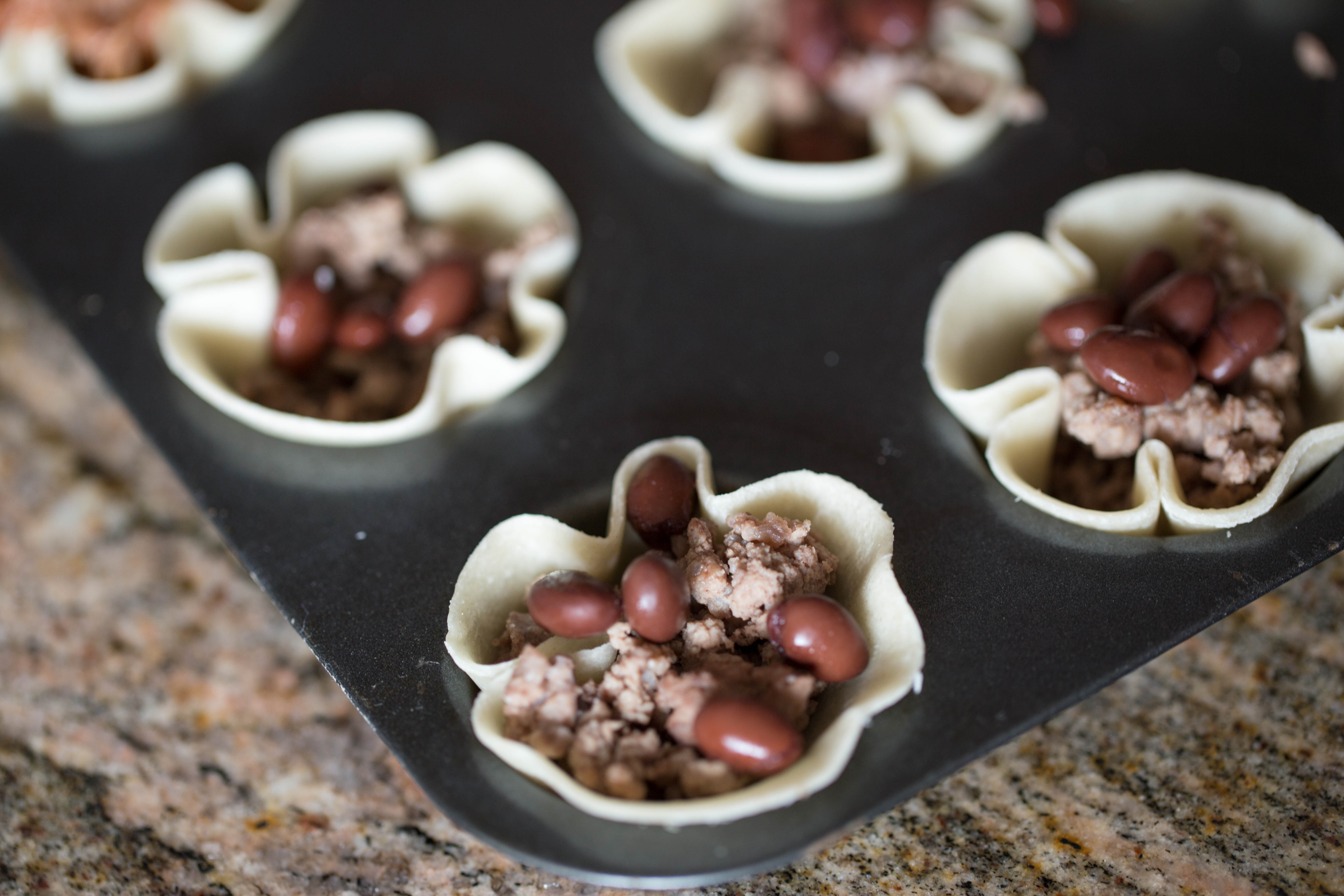 IMG_1000-1For the taco flavor, I place about a teaspoon of ground hamburger and then sprinkle a few black beans on top.  Don’t fill too full because you’ll need to save some room for your other toppings!IMG_1013-1For the crab and cream cheese, you’ll want to drop a nice, full rounded teaspoon of mixture (see recipe below)