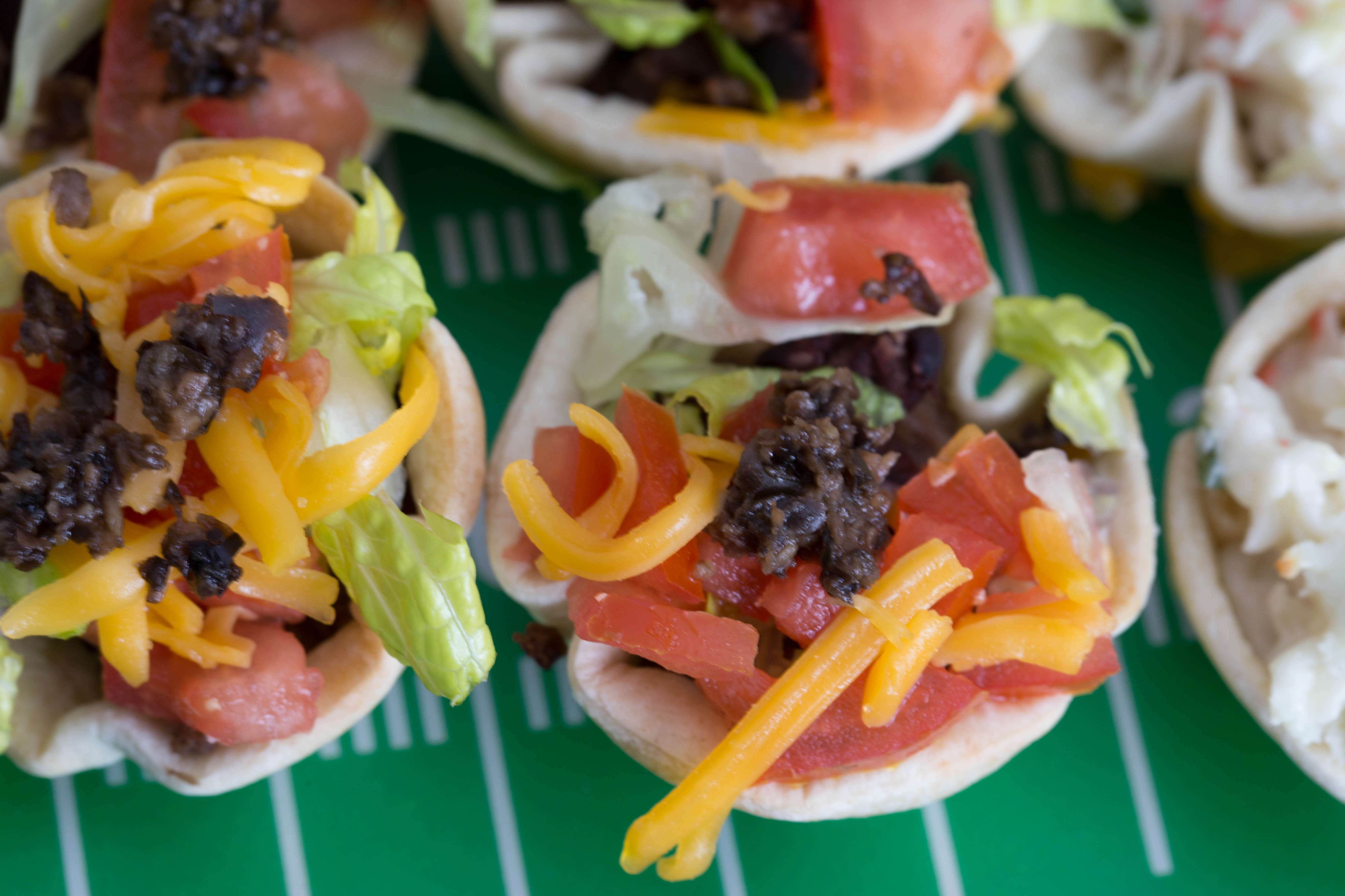 After the taco ones are baked, add any desired toppings.  I added lettuce, tomato, cheese and chopped olives. Don’t they look festive?