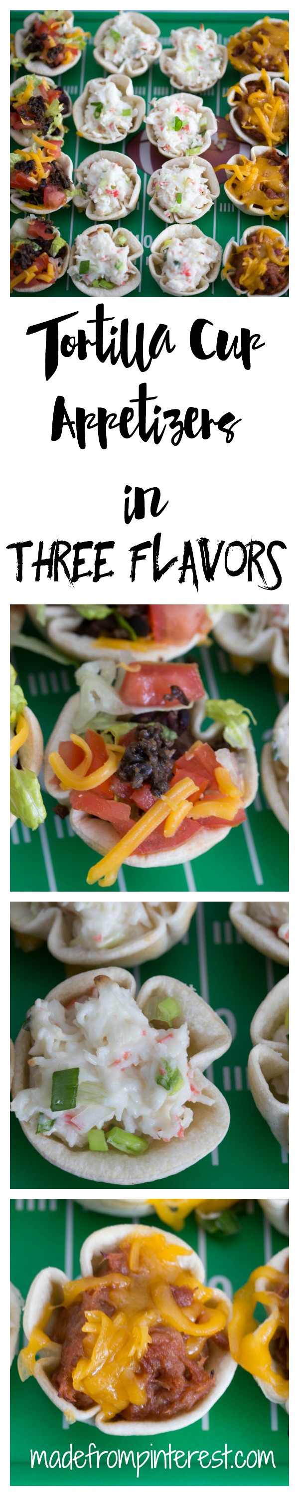 We have the answer to the question, what am I going to make for game day? In no time at all, you can have these Tortilla Cup Appetizers cooked up and hot and ready for your guests. Fill them with anything that you like, but we chose Taco, Crab and Cream Cheese and BBQ Pork. Your family and guests will love them.