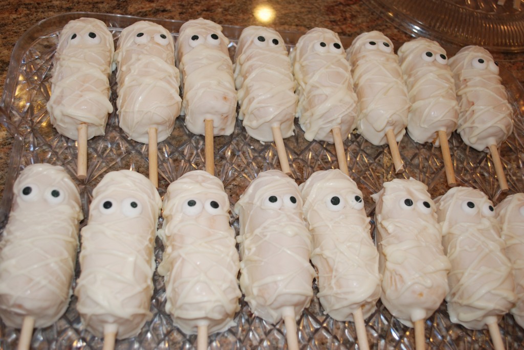 After firming up in the freezer for about 15 minutes, it was time to drizzle some more almond bark to imitate the strips of cloth and behold…TWINKIE MUMMIES!