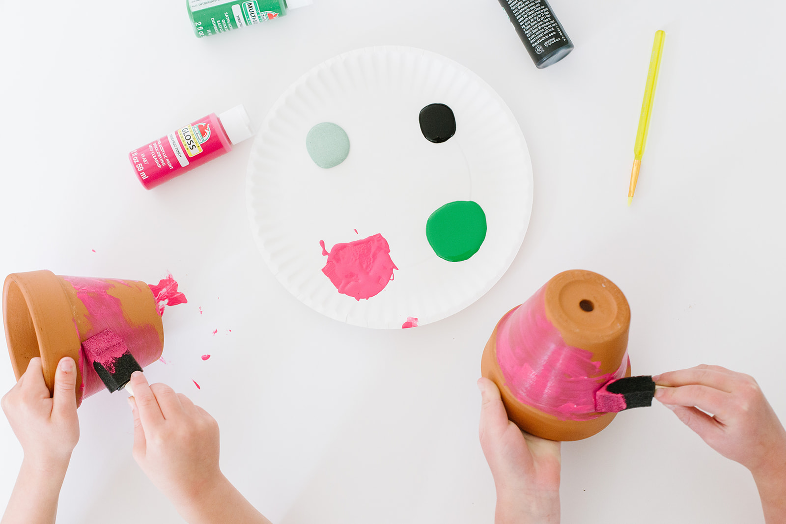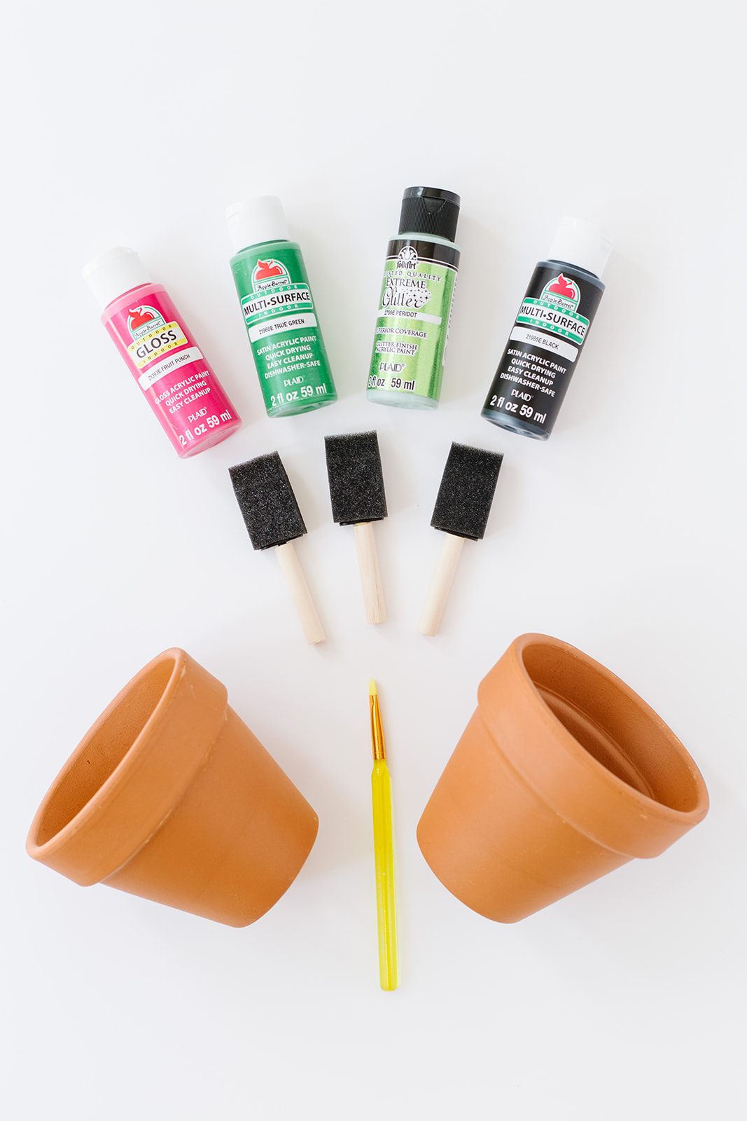 Terra Cotta Pot (any size), foam paint brushes, small paint brush and then some acrylic craft paint in pink, light green, kelly green and black.  Red paint would also be a great choice if you like that look better instead of pink.