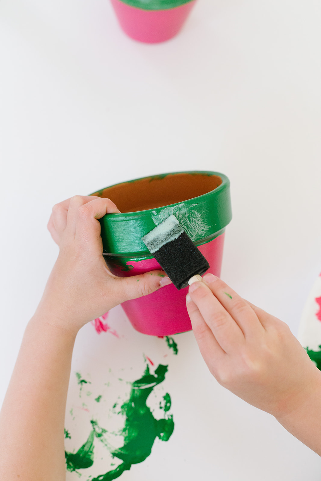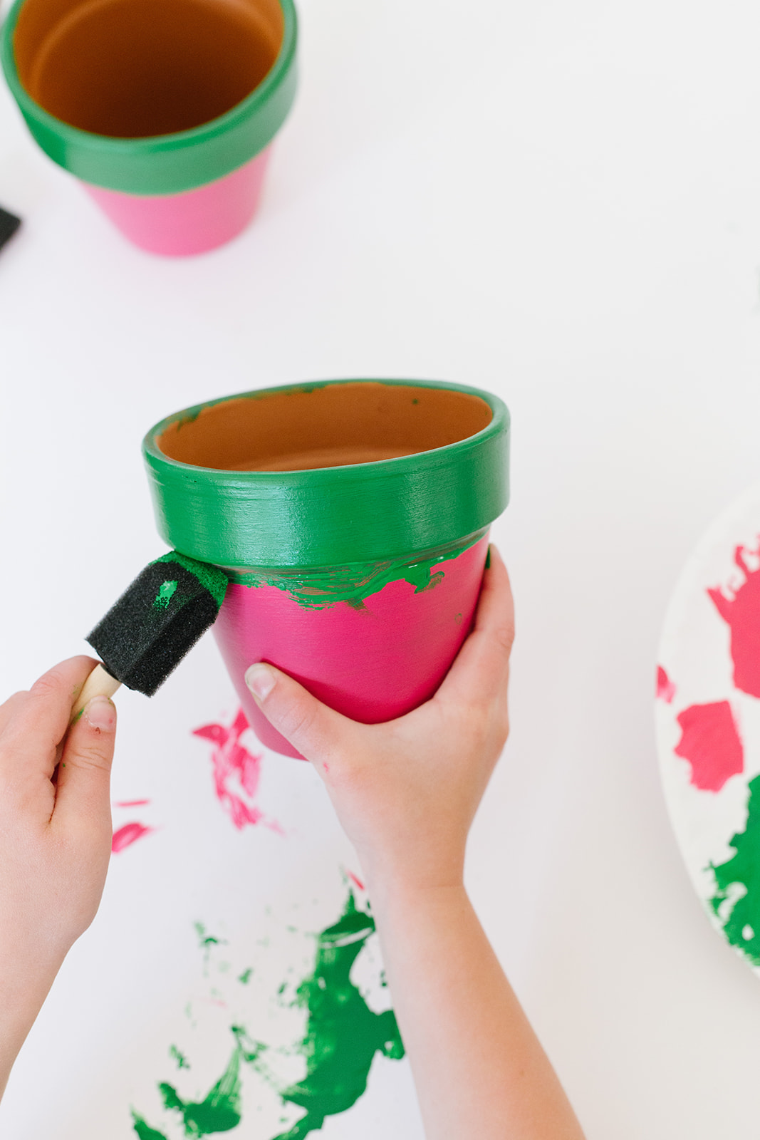 Start by taking a foam brush and painting the bottom part of the pot with the pink paint.  Let completely dry.  Paint another coat if needed.