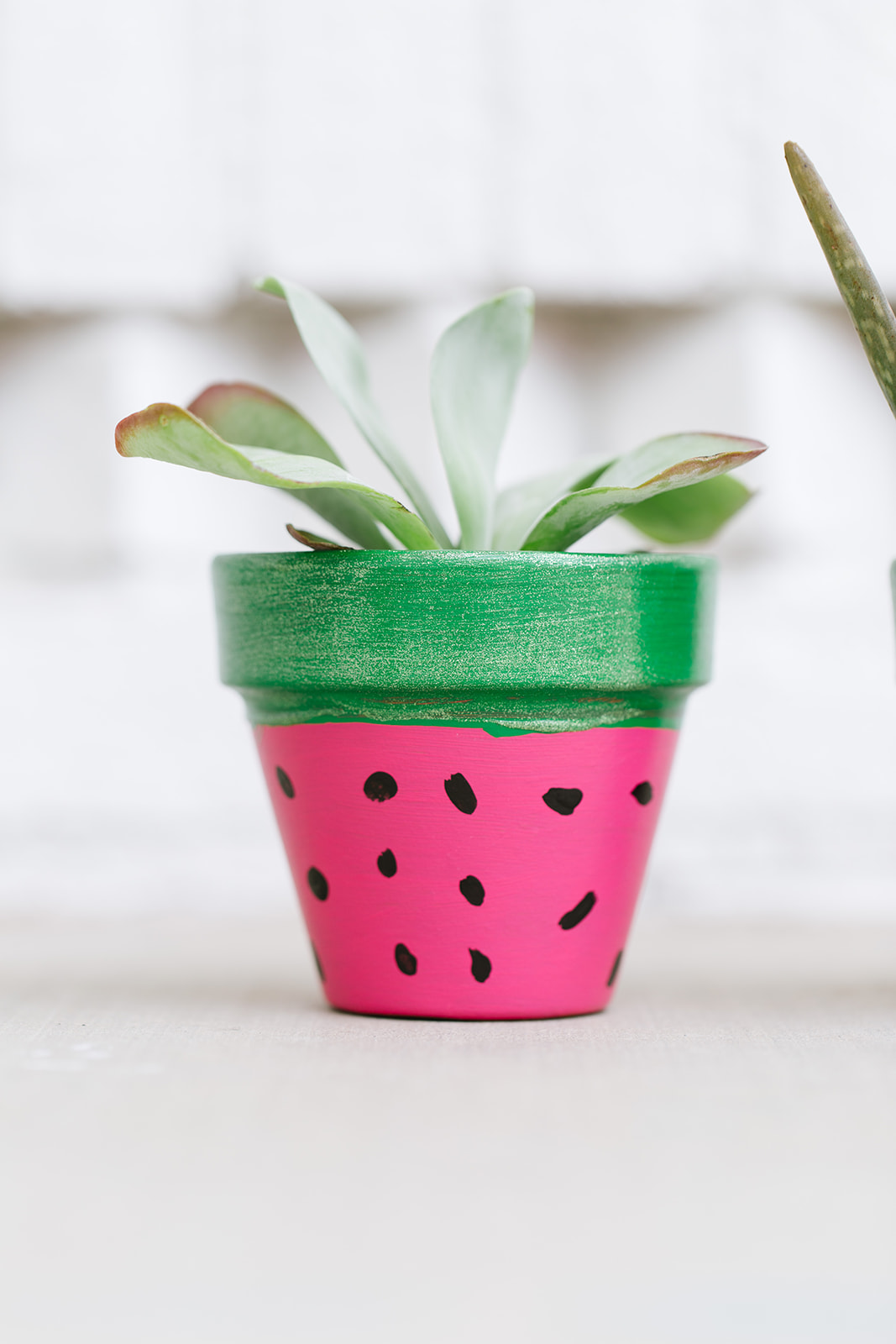 Let all paint completely dry and then you are ready to plant.  You can plant flowers but we love the look that the succulents make in these Watermelon Flower Pots.